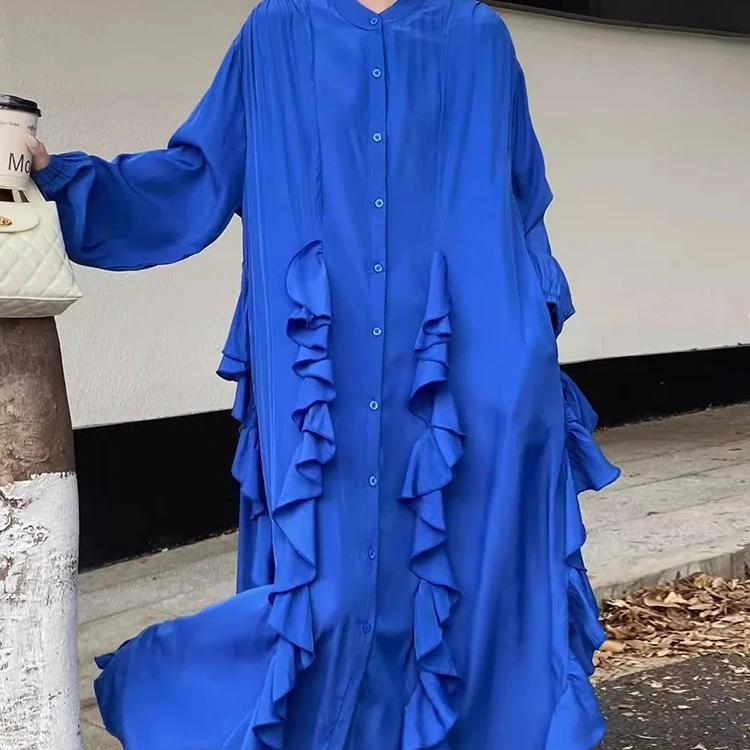 Шикарные платья Весеннее французское элегантное платье с нерегулярными оборками Длинные рукава Длинная юбка Женские платья One Size синий