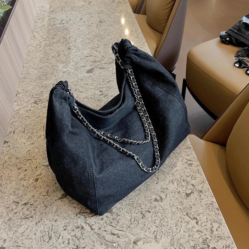 Шикарный стиль Сумки-тоут на плечо с большой цепью для женщин 2023 Роскошные дизайнерские сумки Джинсовая ткань Однотонные Вместительные сумки для покупок 52x28x18cm чёрный