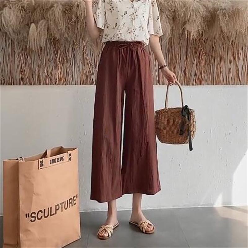 Широкие брюки для женщин, летние хлопковые льняные брюки, однотонные дышащие свободные брюки с эластичной резинкой на талии, большие размеры XXL кофейный