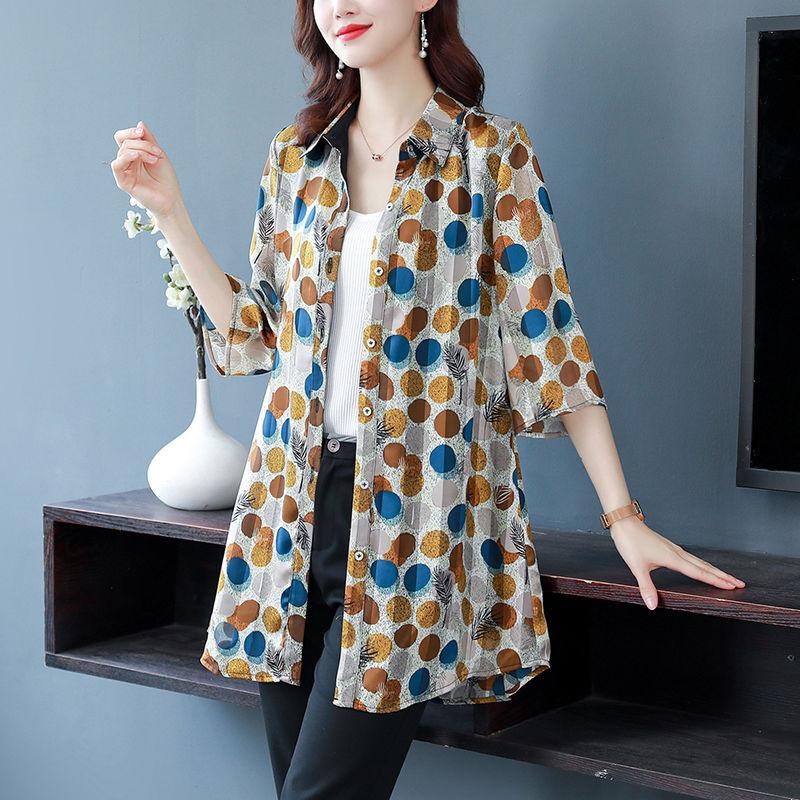 Шифоновая рубашка, женская футболка средней длины, свободная, летняя одежда, воротник в горошек, рубашка с принтом, модная летняя одежда для защиты от солнца 5XL
