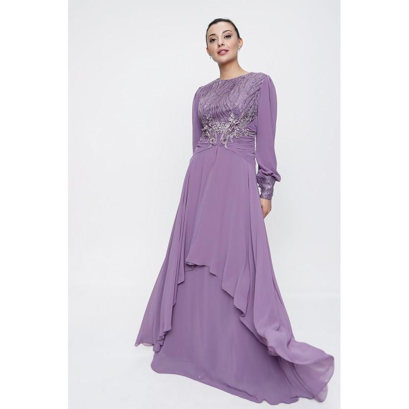 Шифоновое длинное платье с вышитым верхом и объемным цветочным принтом на подкладке