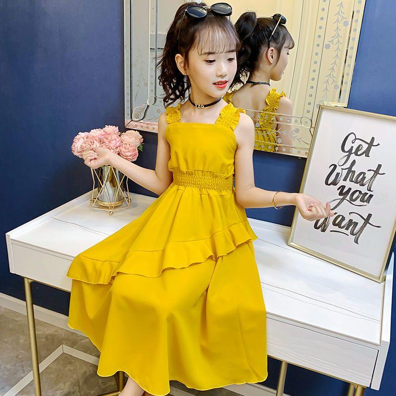 Шифоновое платье для девочек, летнее платье, детское платье принцессы на подтяжках, длинное платье в корейском стиле с однотонным принтом 160 жёлтый