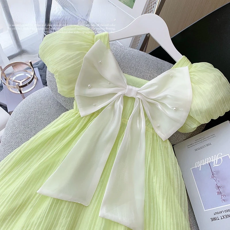 Шифоновое платье для девочек с бантом и бусинами, летнее Новое однотонное платье-трапеция с V-образным вырезом и рукавами-фонариками, милая ...