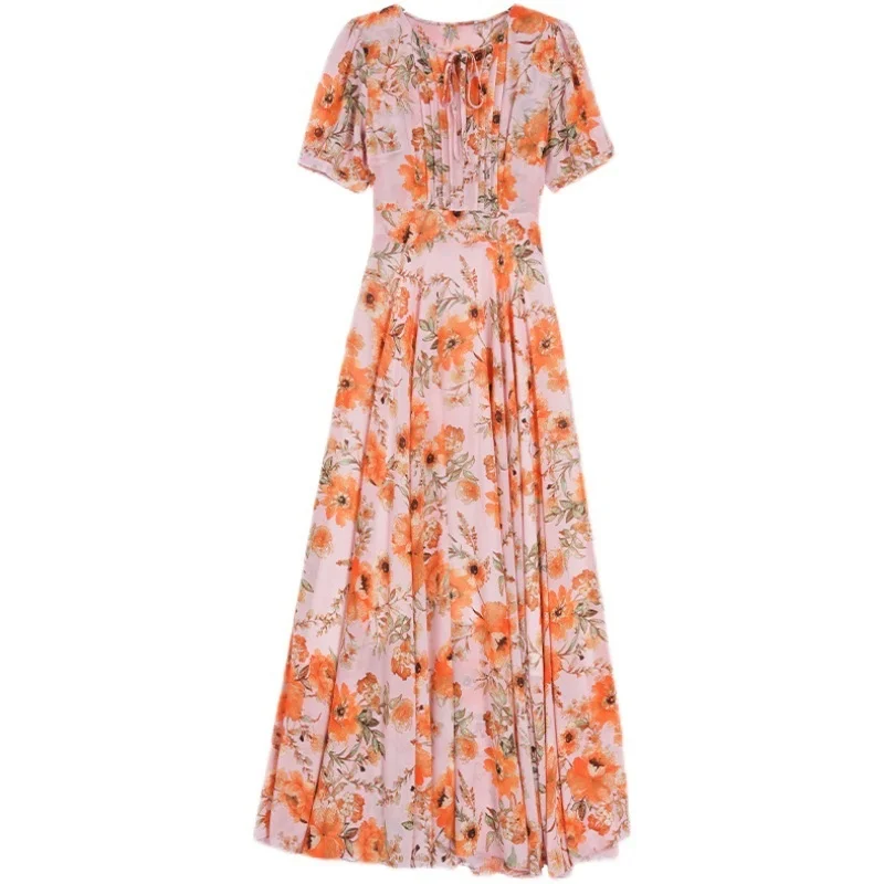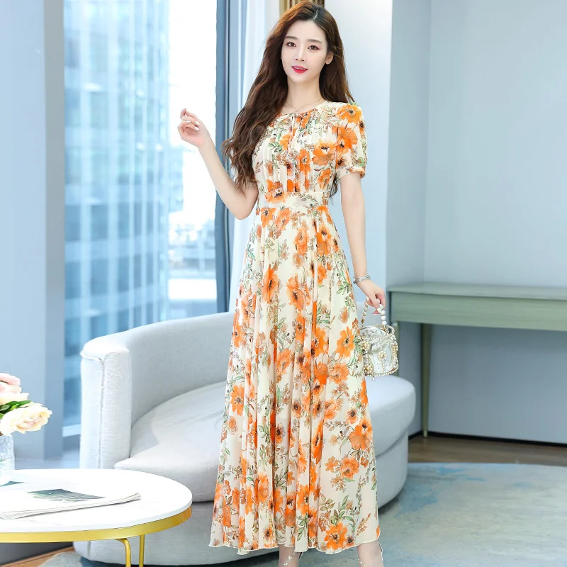 Шифоновое платье с коротким рукавом, приталенное платье большого размера в иностранном стиле, новая летняя юбка с цветочным принтом, для же...