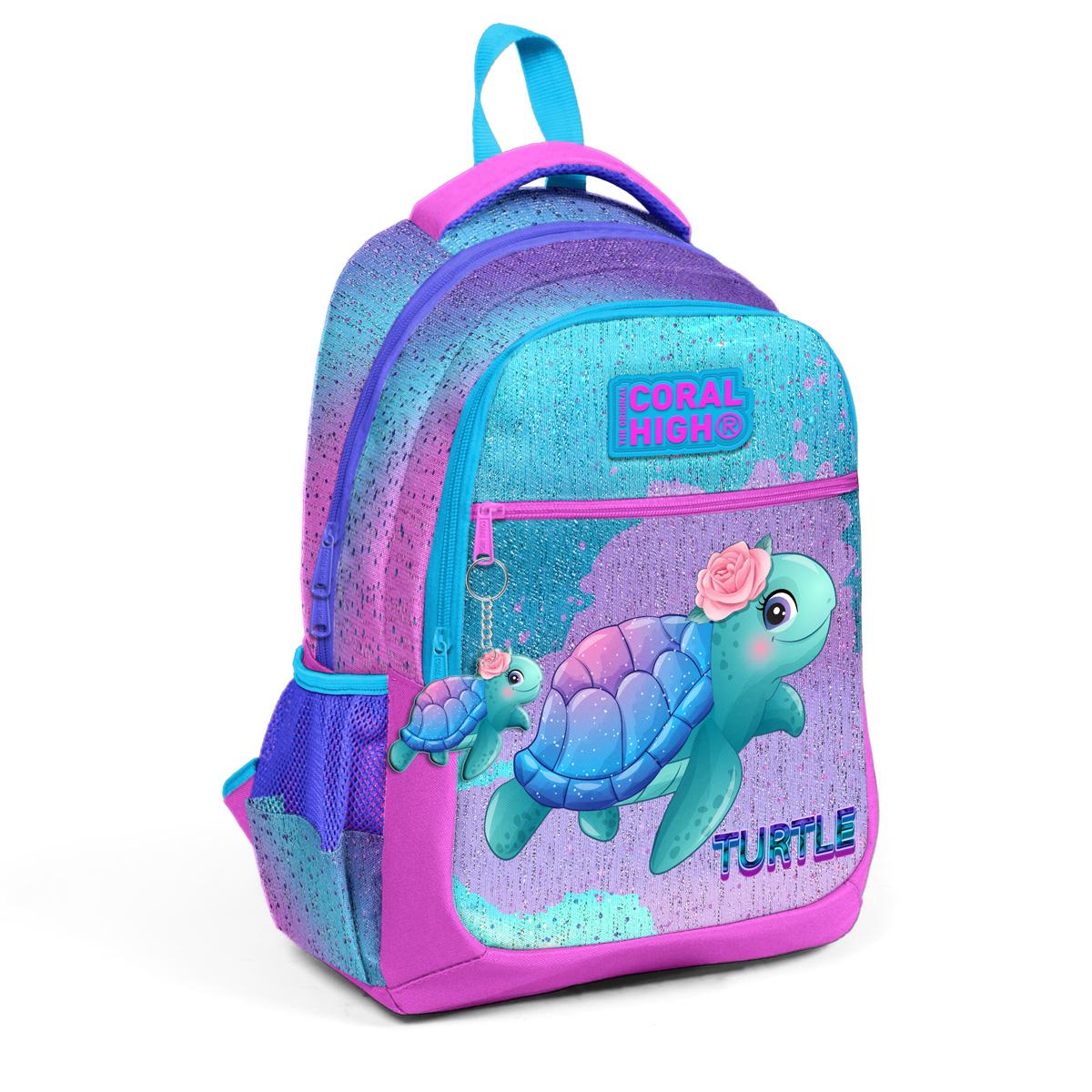 Школьный рюкзак с тремя отделениями Coral High Kids, светло-розовый, синий, с рисунком черепахи, 23497