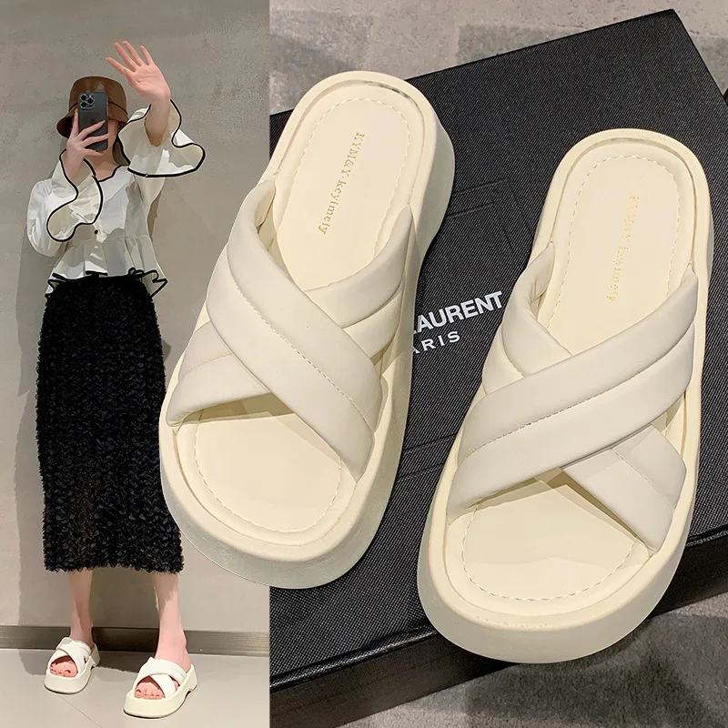 Шлепанцы женские домашние на платформе, пляжная обувь, роскошные сланцы, мягкая Дизайнерская обувь на плоской подошве, римская мода, ПУ ткань, 2023