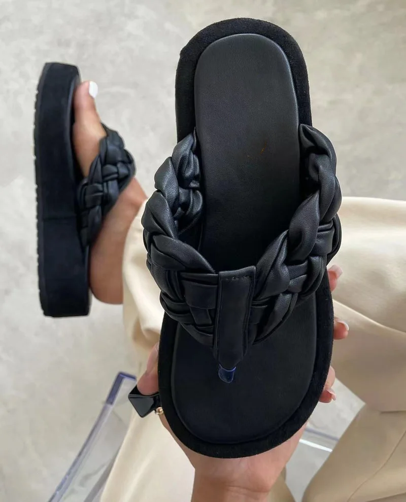 Шлепанцы женские из ПУ кожи, Элегантные дизайнерские сандалии на плоской платформе, с плетеным ремешком, уличная пляжная обувь, летние