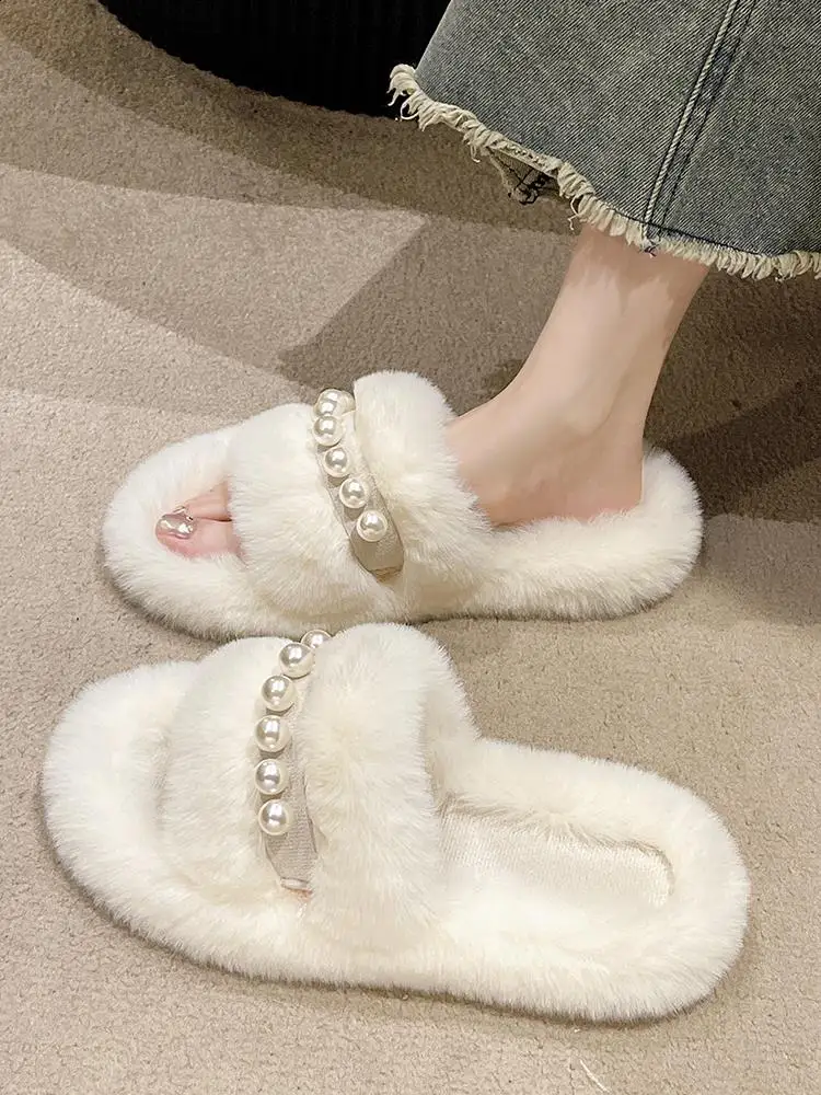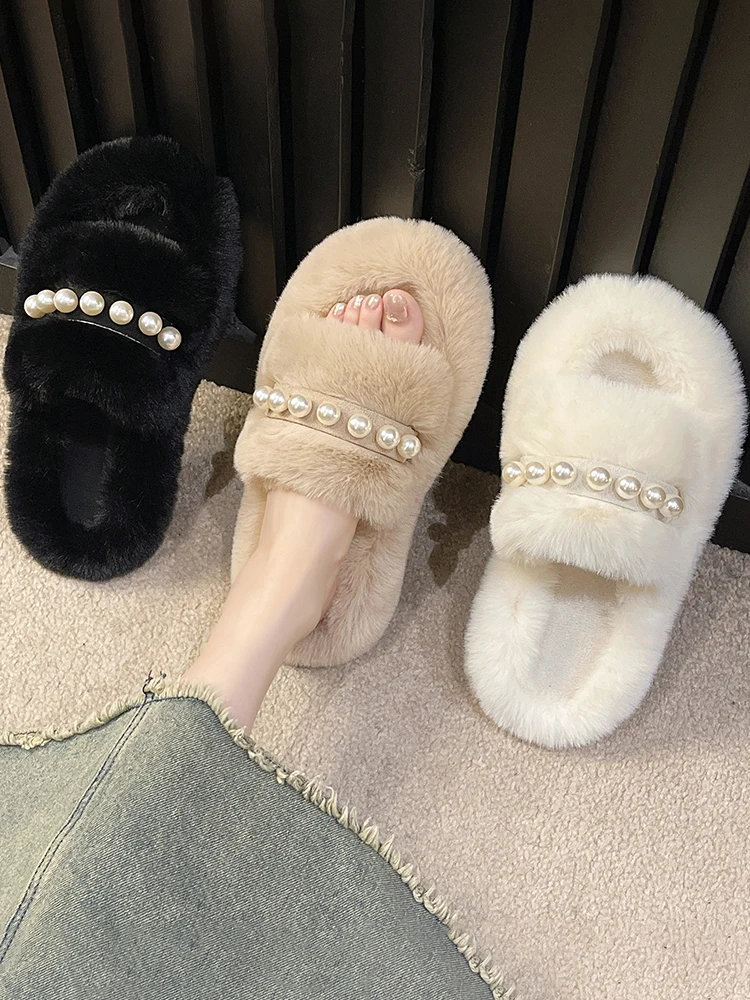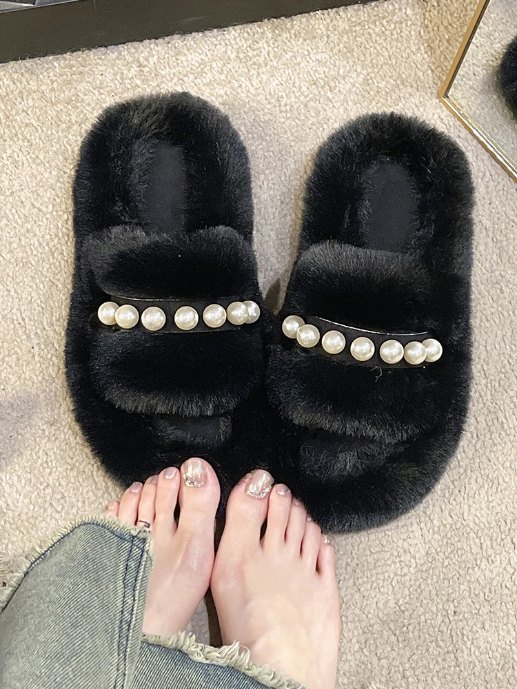 Шлепанцы женские меховые, сланцы из флока на платформе, с бусинами, плоская плюшевая обувь, резиновая базовая обувь в римском стиле, 2023
