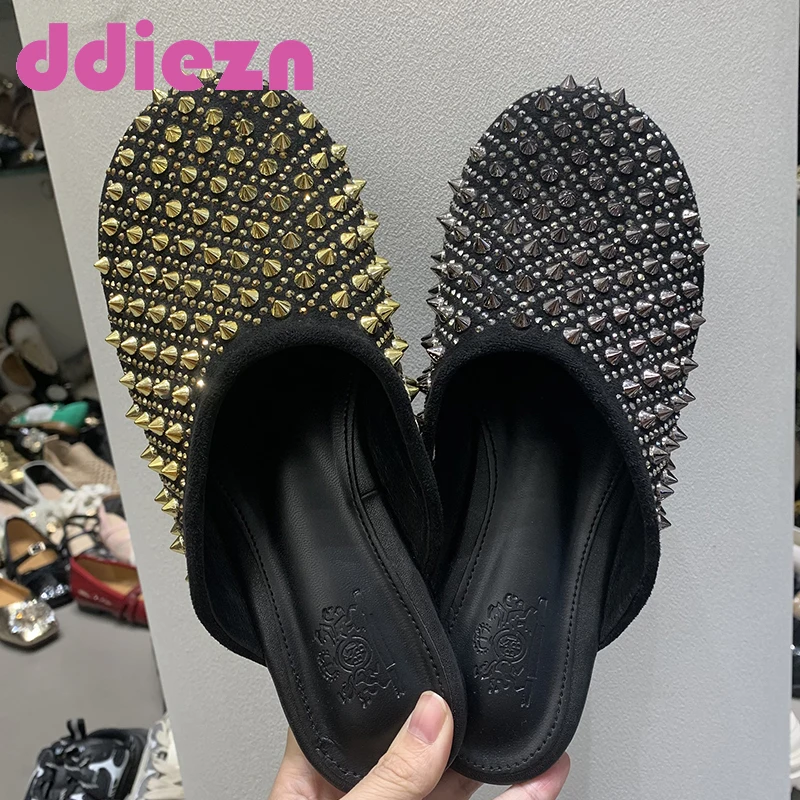 Шлепанцы женские с заклепками, пляжная обувь для улицы, металлические тапочки, сланцы, мюли, модная летняя женская внешняя обувь
