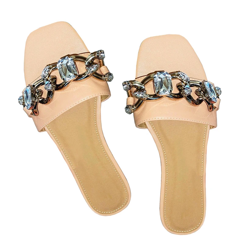 Шлепанцы женские с квадратным носком, сланцы из металла, на плоской подошве, Повседневная летняя прошитая обувь с цепочкой и кристаллами, лето 2021
