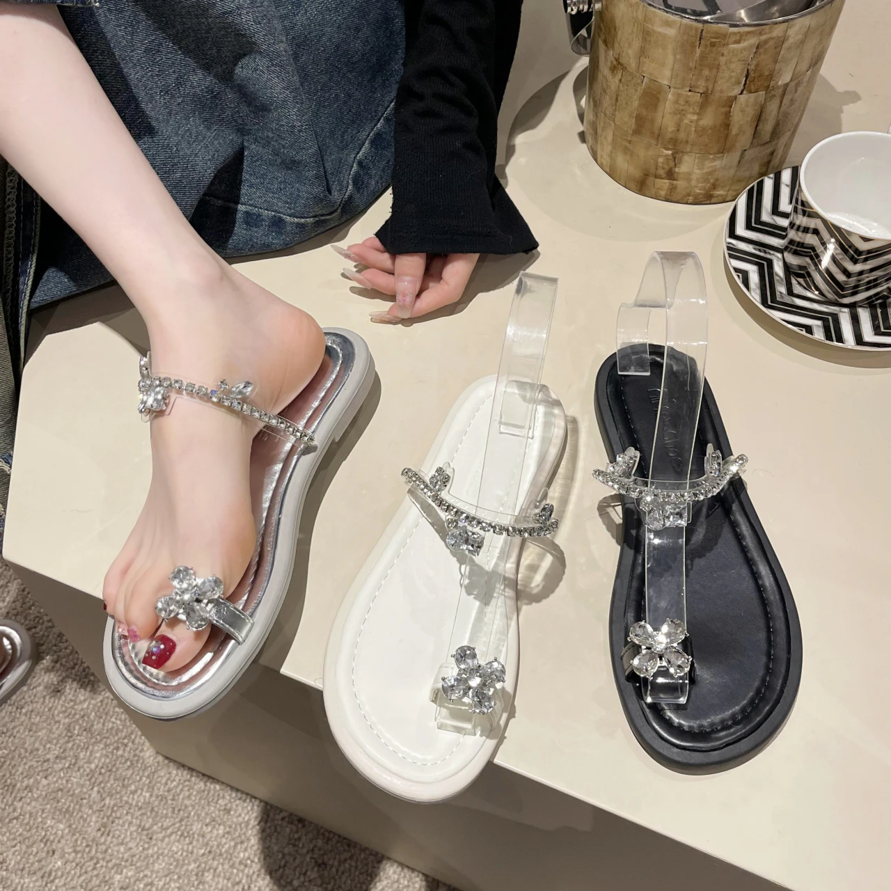 Шлепанцы женские с кристаллами, сланцы для пляжа, мягкая подошва, плоская подошва, Повседневные Удобные тапочки, летняя модель 2023