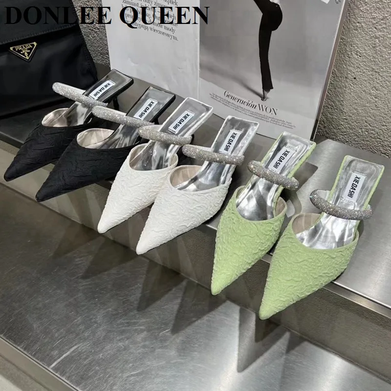 Шлепанцы женские с острым носком, модные плиссированные шелковые мюли, брендовые дизайнерские сланцы с ремешком с кристаллами, уличные шле...