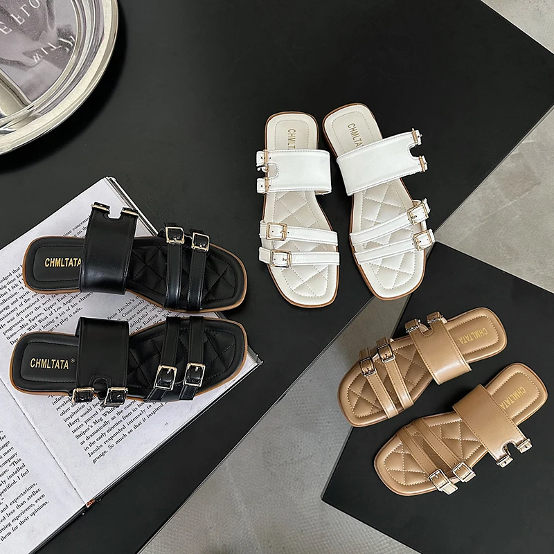 Шлепанцы женские с открытым носком, мягкая подошва, пряжка для ремня, плоская подошва, Элегантные Тапочки для отдыха на открытом воздухе, пл...