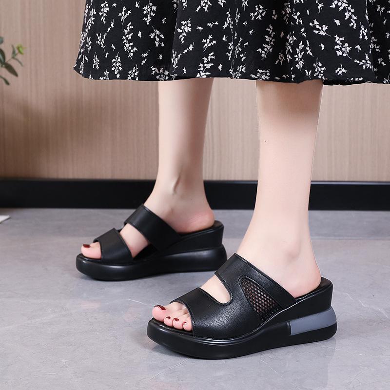 Шлепанцы на танкетке женские 2025 лето новые высокий каблук толстая подошва шлепанцы на одном ремешке для улицы с открытым носком женские крутые шлепанцы женские 35 чёрный