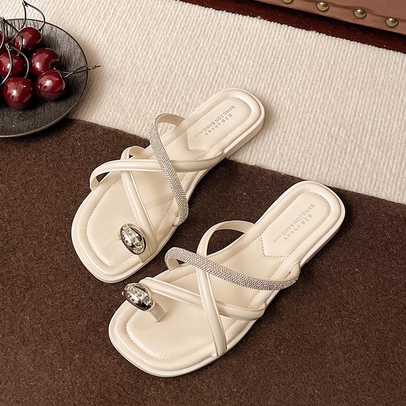 Шлепанцы на толстой подошве женские летние модные французские с перемычкой для пальцев сандалии высокого класса со стразами темперамент красивая стопа пляж 35 бежевый