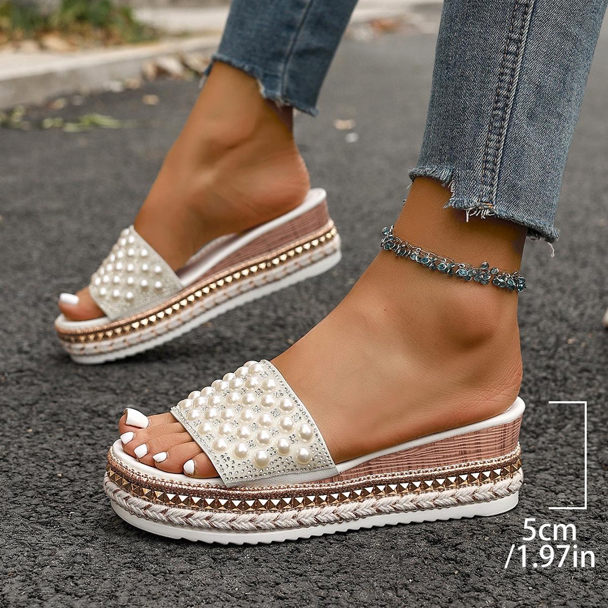Шлепанцы на толстой подошве женские летние новые на плоской подошве ленивые с жемчужным декором в стиле ветра уличные повседневные крутые шлепанцы 36 белый