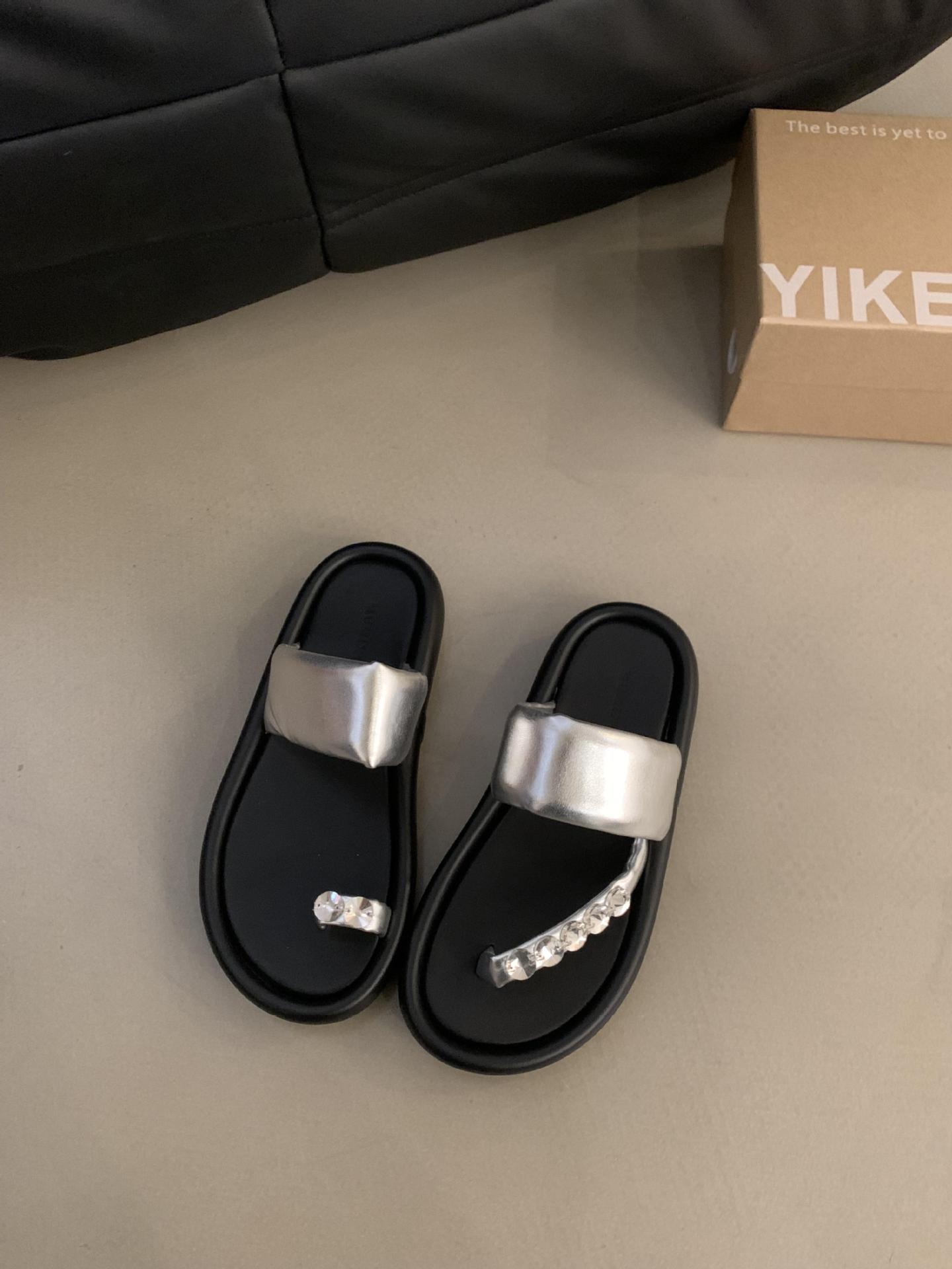 Шлепанцы на толстой подошве со стразами женские летние фея ветер нескользящие слово с пляжным отпуском сандалии с пальцами 40 серебряный