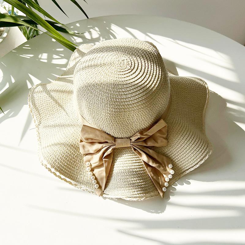 Шляпа Универсальный Стиль Соломенная Плетеная Сладкий Жемчужный Бант Женские Солнцезащитные Шляпы бежевый