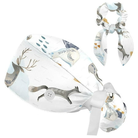 Working Cap with Buttons and Sweatband Scrub Hat Bouffant Caps with Scrunchie Winter Animals Tie Back Hats