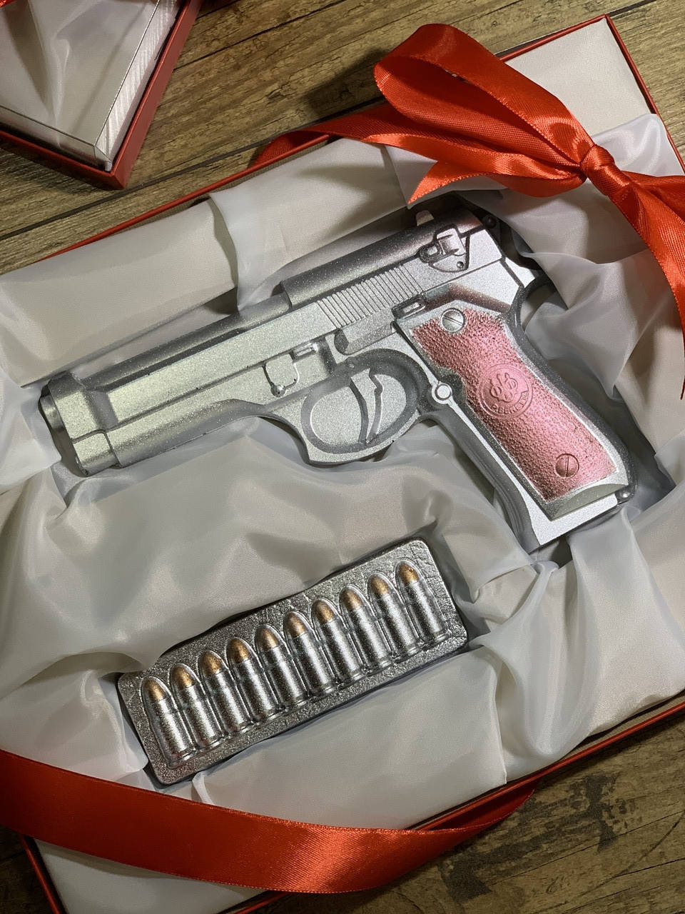 Вживую шоколадный пистолет выглядит как настоящий, сразу так и не отличить.