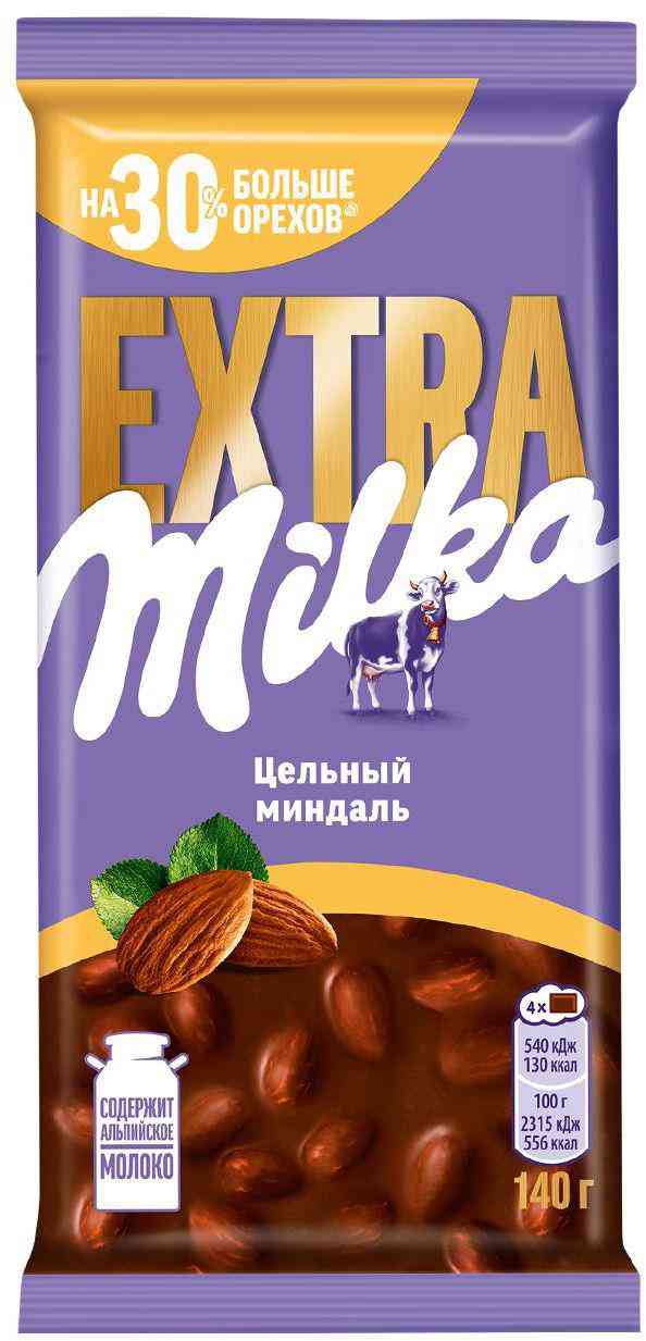 Milka Extra с цельным миндалем — большая плитка нежного шоколада молочного с ароматными цельными орехами. Шоколад изготовлен из какао высокого качества с добавлением альпийского молока и содержит на 30%* больше орехов. Поэтому каждая шоколадка дарит море удовольствия и нежности!В каждом кусочке шоколада с орешками вы почувствуете несравненную нежность молочного шоколада Milka, а также яркий вкус и аромат цельного миндаля. Это классическое сочетание просто создано для наслаждения вкусом и хорошего настроения. Попробуйте любимый шоколад с миндалем в новом исполнении!Шоколад с цельным миндалем дополнит чашечку кофе на завтрак, подойдет для быстрого перекуса и уютного семейного вечера. Соберите друзей и родных за одним столом и возьмите шоколад в большой плитке к чаю, чтобы почувствовать близость и разделить наслаждение вкусом. Большая шоколадка Milka — это не просто сладость к чаю. Это простой способ выразить свою любовь, подарить искреннее тепло и нежность. Преподнесите шоколад в подарок своей половинке или родному человеку — на праздник или без повода. Наполняйте жизнь приятными моментами вместе с шоколадом Milka!*В пересчете на 100 г по сравнению с «Шоколад молочный «Милка» с цельным миндалем» 80 г.