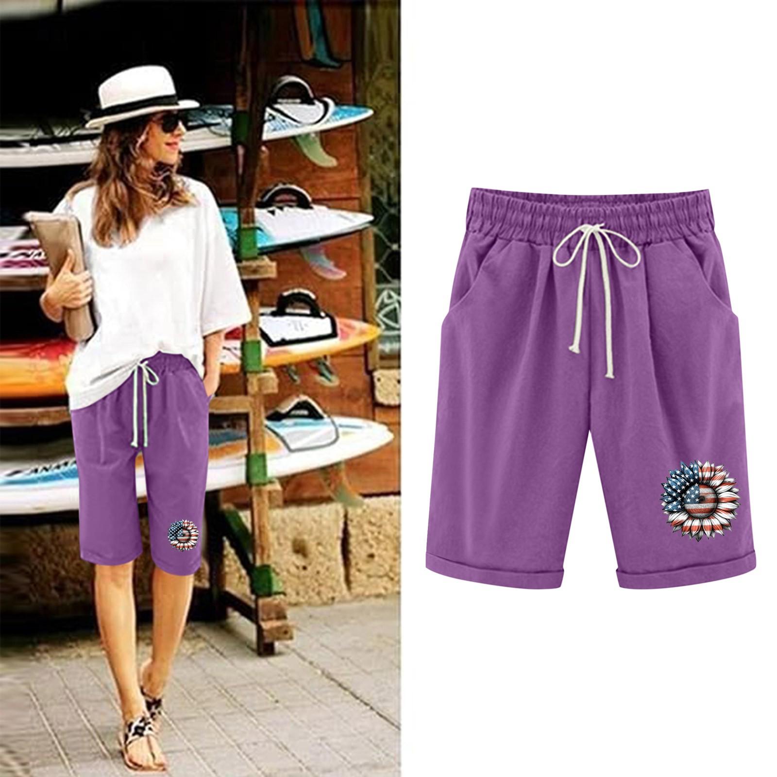 Шорты больших размеров для женщин, эластичные пышные хлопковые льняные шорты-бермуды с эластичной резинкой на талии, повседневная пляжная одежда XXL фиолетовый