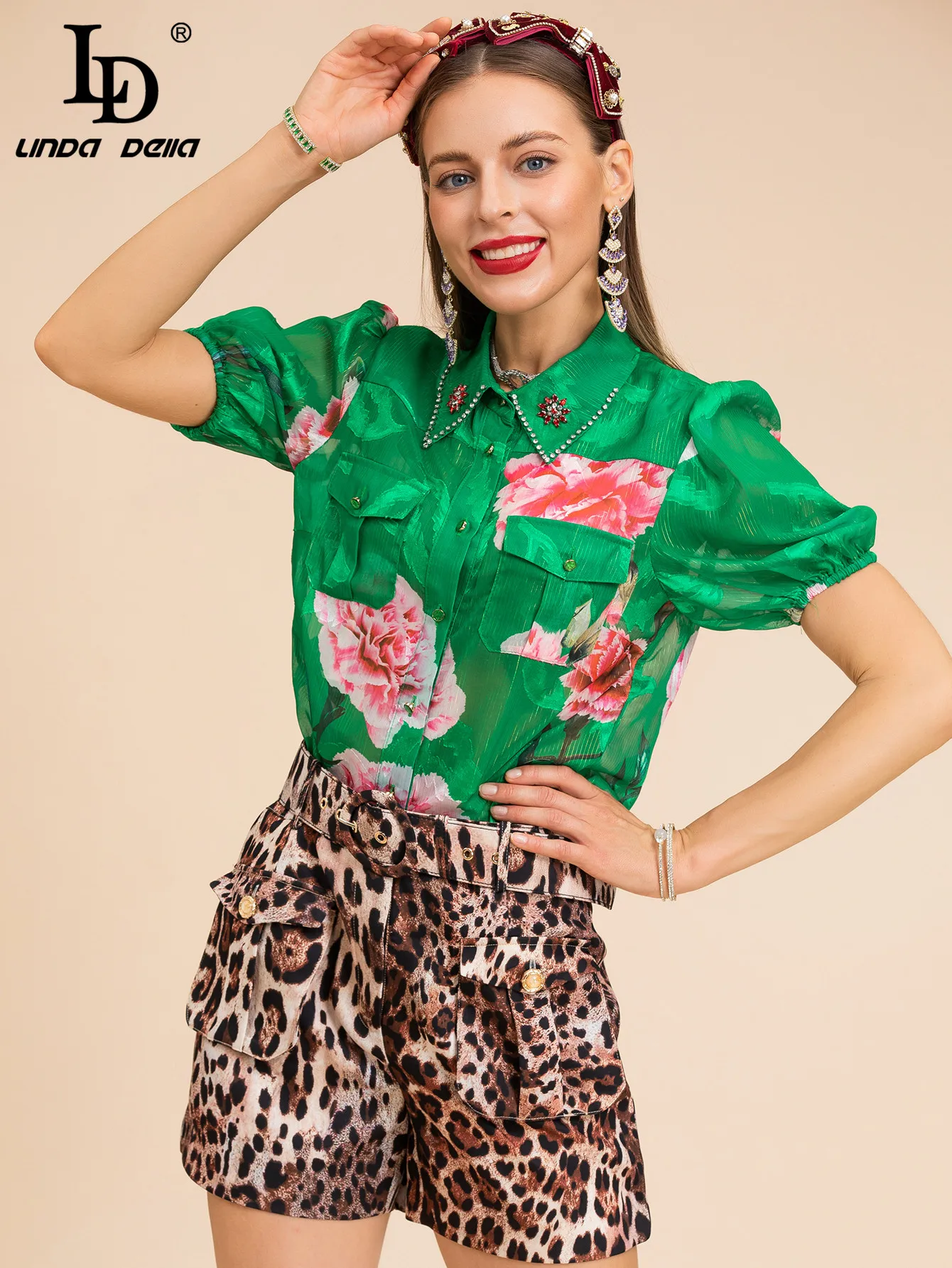LD LINDA DELLA Designer Summer Vintage Shorts Suit Women's Puff sleeve Green Floral Shirts and Leopard print Shorts 2 Pieces Set