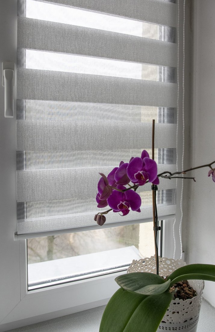 день-ночь, затеняющие (Dim-out), 43x160 см, крепление к раме/к потолку/к стене, полиэстер, серебристый/белый