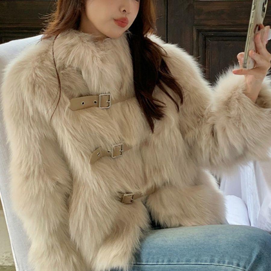 Экологичная зимняя меховая куртка с пряжкой, шикарная и теплая с лисьим мехом, идеально подходит для миниатюрных женщин L абрикосовый