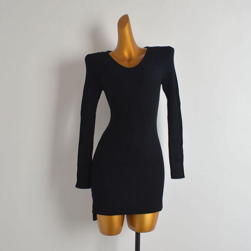 Экспорт Однотонное платье из вязаной шерсти с V-образным вырезом Женская одежда Осень/Зима Приталенное Миди Длинное Двойные разрезы по бокам Юбка-годе Black M