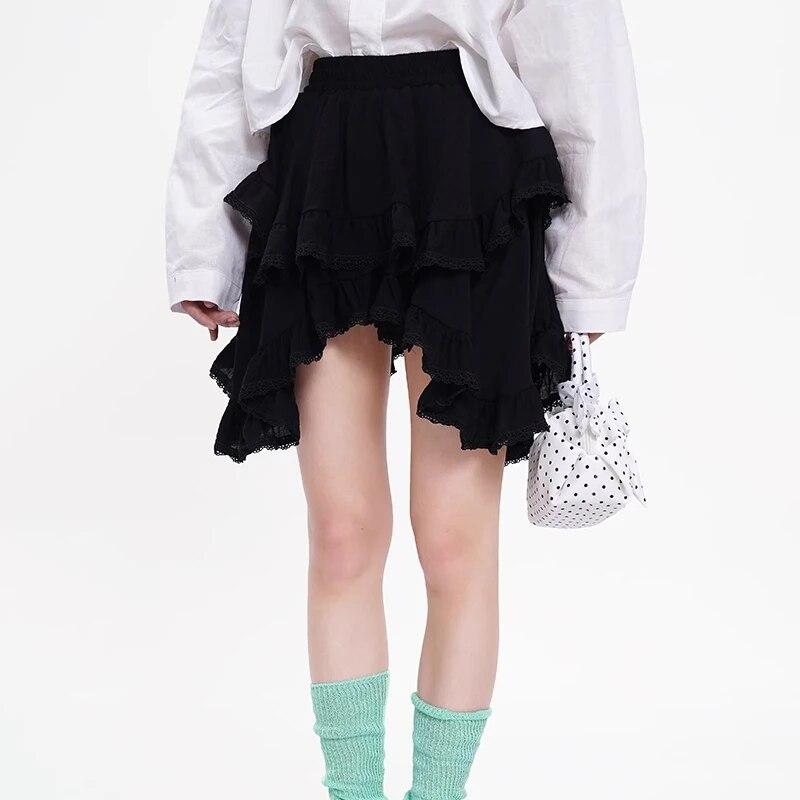 Эластичная талия, белая, черная, нерегулярная мини-юбка Kawaii, школьная короткая юбка в японском стиле Y2k с эстетическими оборками, женская уличная одежда S чёрный