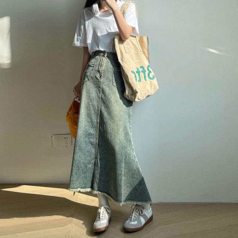 Элегантная женская летняя юбка-бюстье в форме груши с необработанными краями, большого размера, с высокой талией, тонкая, средней длины, с вырезом «рыбий хвост» в стиле ретро, удобная модная джинсовая юбка-бюстье XXL джинсовый