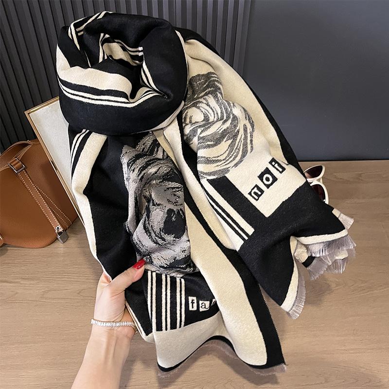 Элегантная женская пашмина с камелиями, зимняя, толстая, теплая, двусторонняя, с кисточками, шаль, защита от холода, защита от ветра, одеяло-шарф