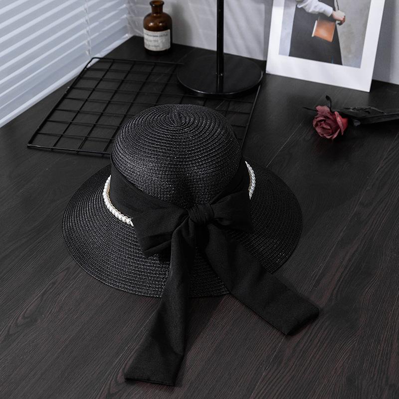 Элегантная женская шляпа от солнца с бантом и искусственным жемчугом — дышащая широкополая соломенная кепка для лета ONE SIZE чёрный