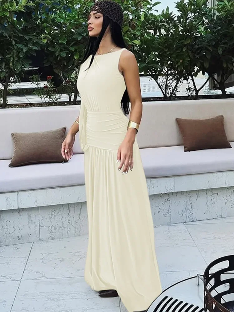 Sleeveless Backless Pleated Sexy Maxi Dress For Women Fashion Solid Irregular O Neck Ruched Club Party Long Dresses 2025