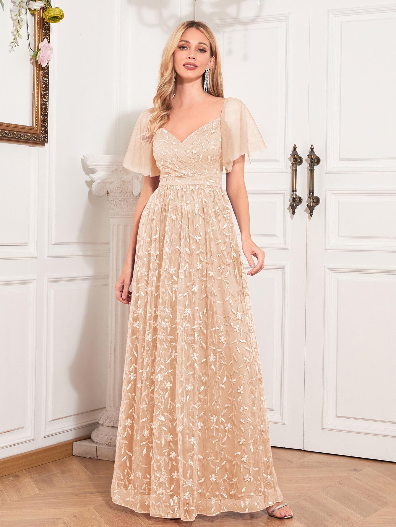 Элегантное вечернее платье А-силуэта с короткими рукавами, V-образным вырезом, U-образной спинкой, прозрачное, с вышивкой и сетчатой подкладкой M