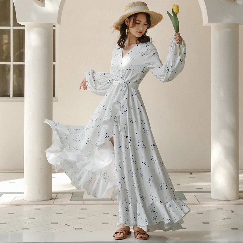 Элегантное винтажное летнее Бандажное белое шифоновое синее длинное платье в горошек с длинным рукавом, сексуальное пляжное макси-платье Б...