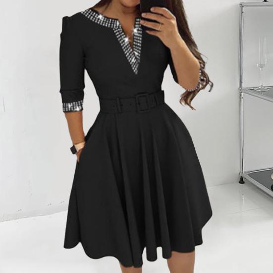 Элегантное женское мини-платье с v-образным вырезом и рукавами 3/4, короткое платье со стразами и карманами на поясе, вечернее платье с распашным подолом
