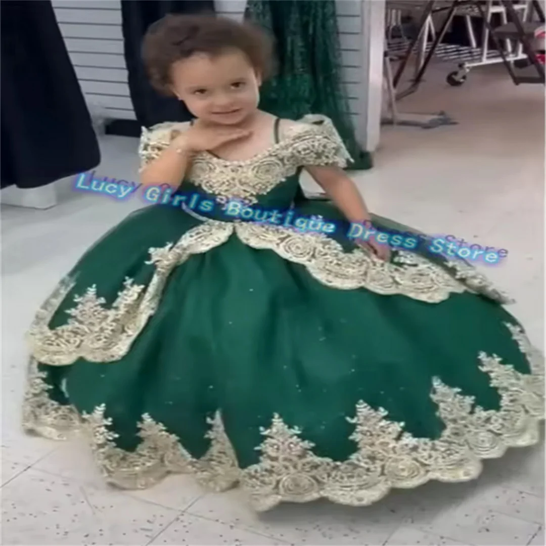 Элегантное зеленое платье с цветочным узором для девочек, пышное тюлевое платье с золотой аппликацией, гала-банкет для свадьбы, бала, вечеринки, детские вечерние платья на день рождения