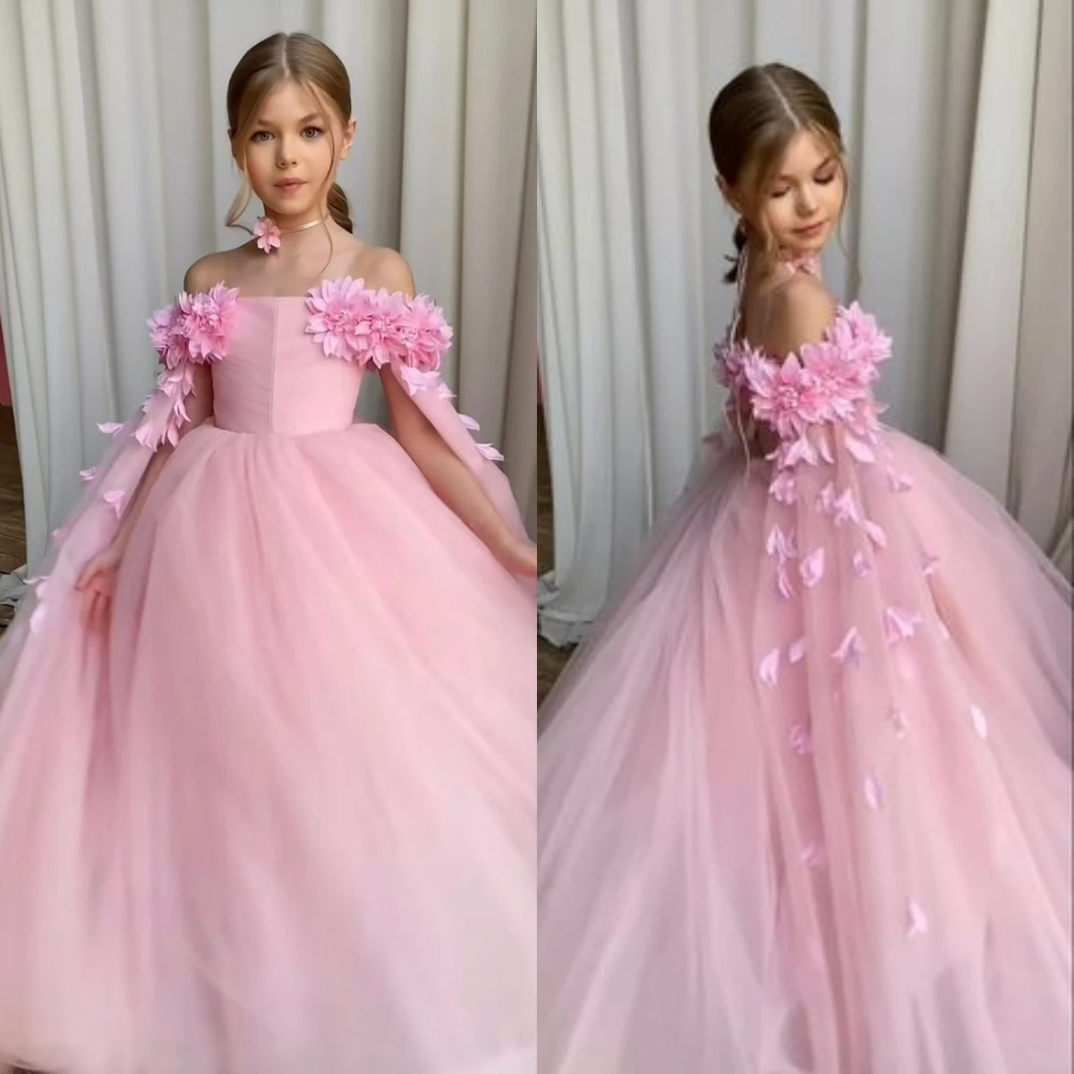 Элегантное качественное розовое платье с цветочным узором для девочек, пышное тюлевое платье с аппликацией для свадьбы, пышное бальное платье принцессы для дня рождения, выпускного вечера