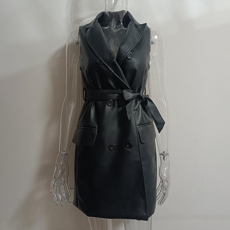 Элегантное кожаное платье-жилет на двубортной застежке с поясом, Осень/Зима 2023 Small чёрный