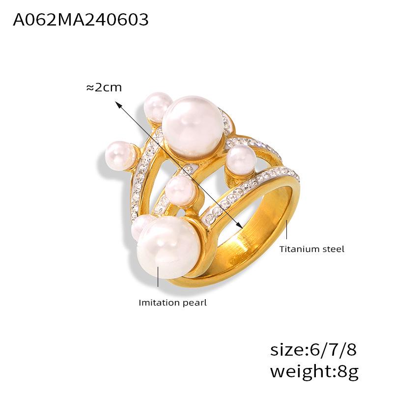 Элегантное кольцо в корейском стиле с жемчугом и бриллиантами - титановая сталь с покрытием из 18-каратного золота Size 8