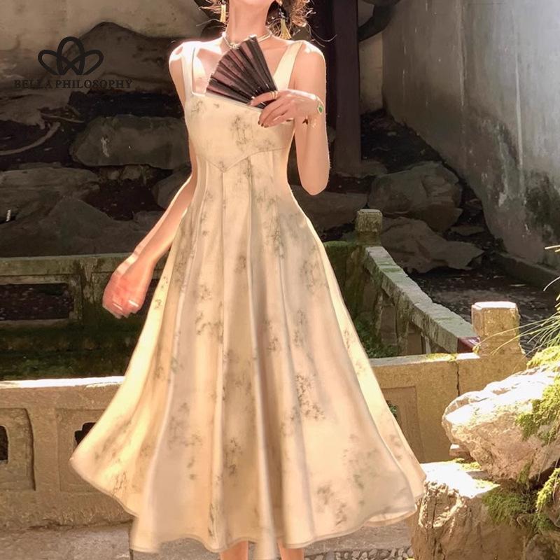 Элегантное платье без рукавов во французском стиле в стиле ретро, новое летнее женское атласное облегающее нишевое дизайнерское платье с принтом M бежевый