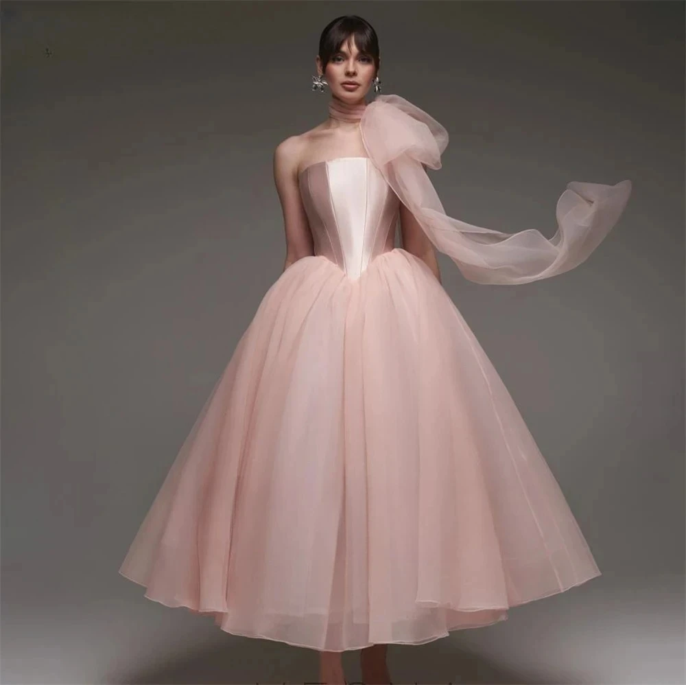 Элегантное розовое вечернее вечернее платье без бретелек с бантом из атласного тюля трапециевидной формы до щиколотки, пышные вечерние платья для выпускного вечера Robe De Soiree