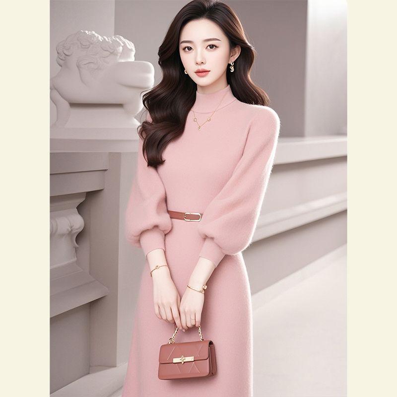 Элегантное розовое вязаное платье с пальто: Шикарный осенне-зимний стиль M (suggested 85-100 jin)