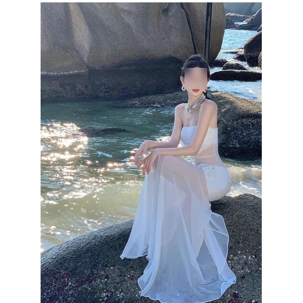 Элегантное французское платье феи без бретелек из прозрачной сетки с юбкой «рыбий хвост» - Белое вечернее или легкое свадебное платье Small