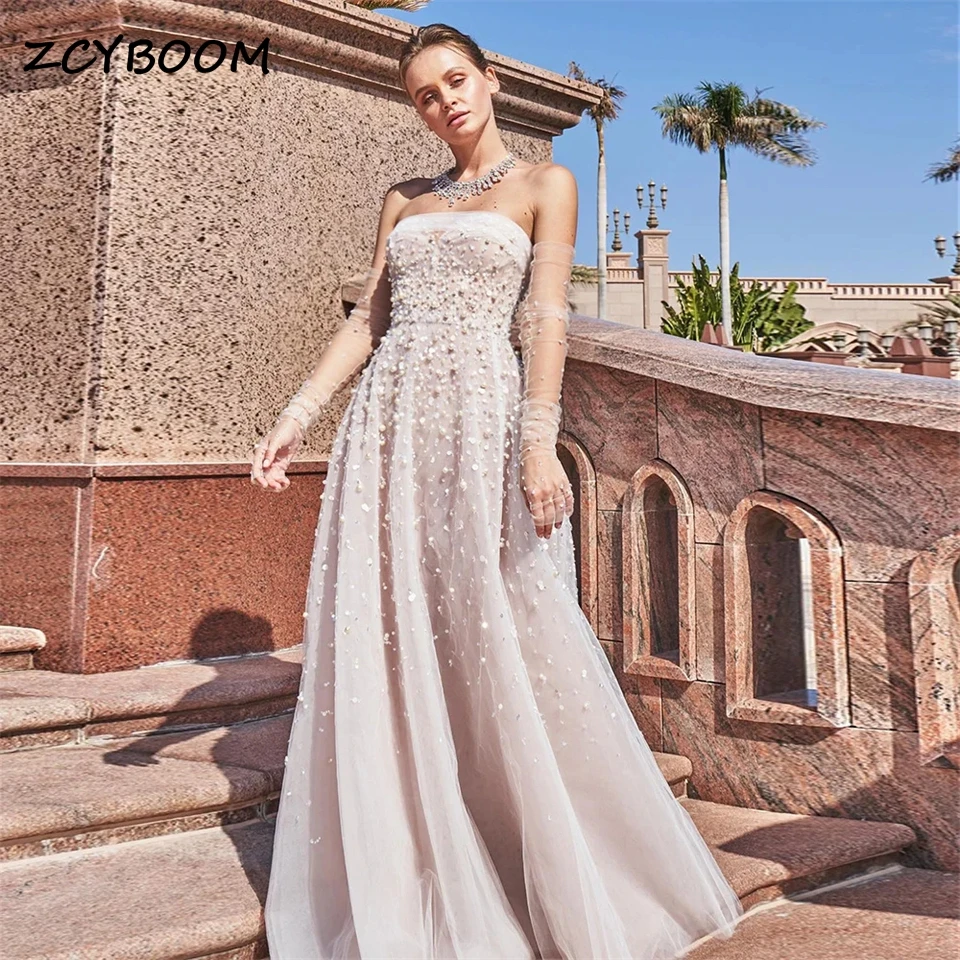 Элегантные вечерние платья трапециевидной формы из тюля с вырезом лодочкой и аппликацией без бретелек 2025 года, платья принцессы со шлейфом для выпускного вечера, платья для дня рождения