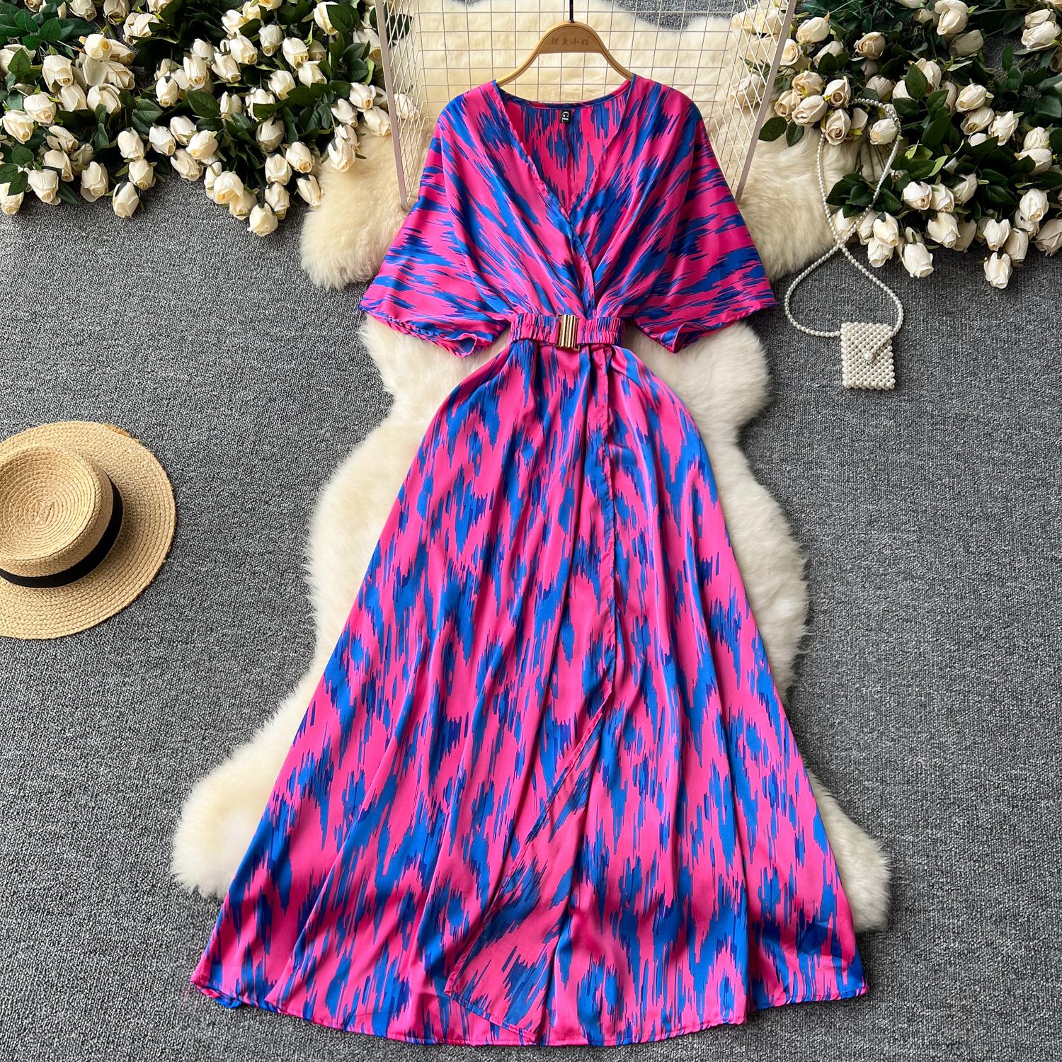Элегантный винтажный v-образный вырез с коротким рукавом и разрезом на принте Платье Шикарные облегающие платья Летние каникулы Вечеринка Женская мода А-силуэта Платья One Size ярко-розовый/синий