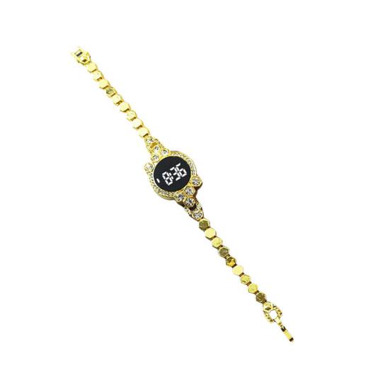 Электронные часы Круглый циферблат с цепочкой-ремешком Отображение даты и времени Блестящая инкрустация стразами Многофункциональные светодиодные цифровые наручные часы с цепочкой из сплава золотистый