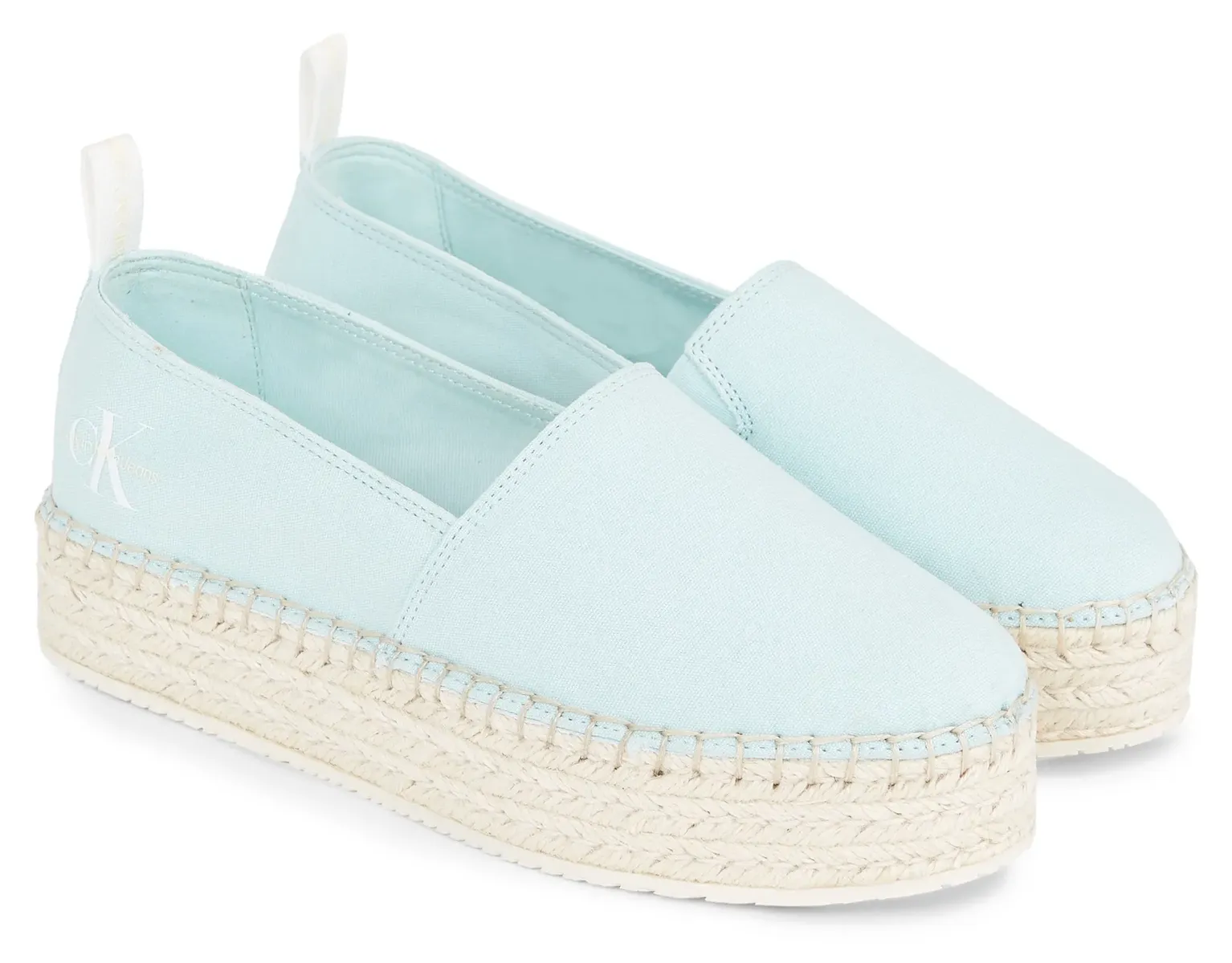 Летние слипоны с логотипом CKВерх из переработанного хлопкаИнтерьер из переработанного текстиляУстойчивая подошва на платформе с типичной джутовой отделкой.Этикетка: Calvin Klein Jeans